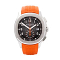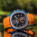 Aquanaut Chronograph Ref. 5968A-001 with a black embossed dial and an orange rubber strap.